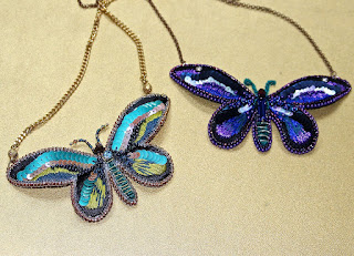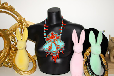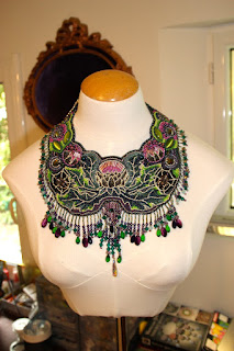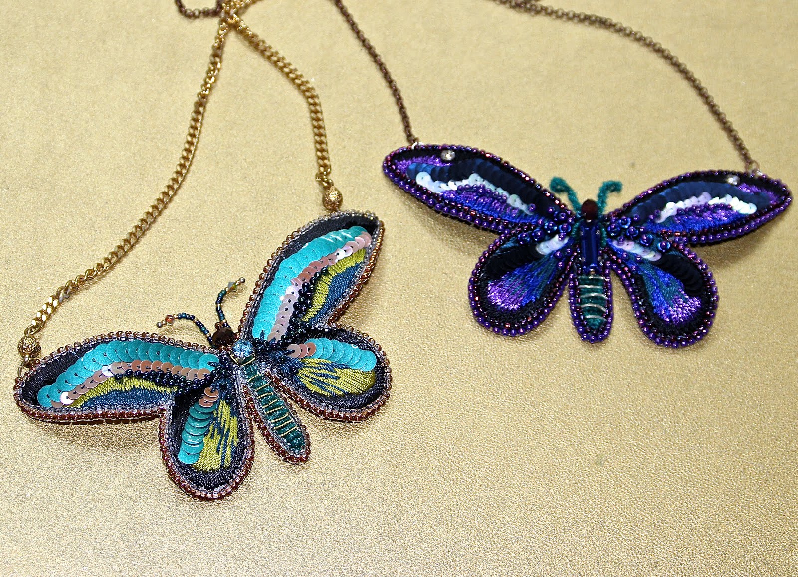 une tête de félin et des pétales de rose On imagine ses créations sur une pochette, sur un manteau, un pull, un sac… Elle crée des bagues, des broches. Ses colliers font penser à des bijoux de cinéma et à voir sur l’atelier à tisser des pétales de roses qui garniront sa future création, on imagine combien chaque bijou a compté d’heures de travail. Or Ioulia est une artiste. Elle ne compte pas ses heures, c’est l’inspiration qui la guide. Elle aime passionnément ce qu’elle fait.