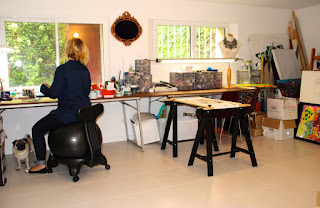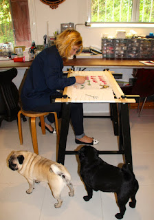 avec Cookie et Maurice dans son atelier Après avoir déposé le petit dernier à l’école , elle s’enferme dans son atelier au rez-de-chaussée d’une maison au fond du jardin. Un écrin où le matin, à la lumière du jour elle pique, coud, brode… avec près d’elle ses trois chiens carlin. Les après-midi sont consacrés à la paperasse et il y en a beaucoup depuis qu’elle a crée sa société. Elle a même, faute de temps, délaissé ses pinceaux, même si une toile immense blanche lui fait de l’œil dans son atelier.